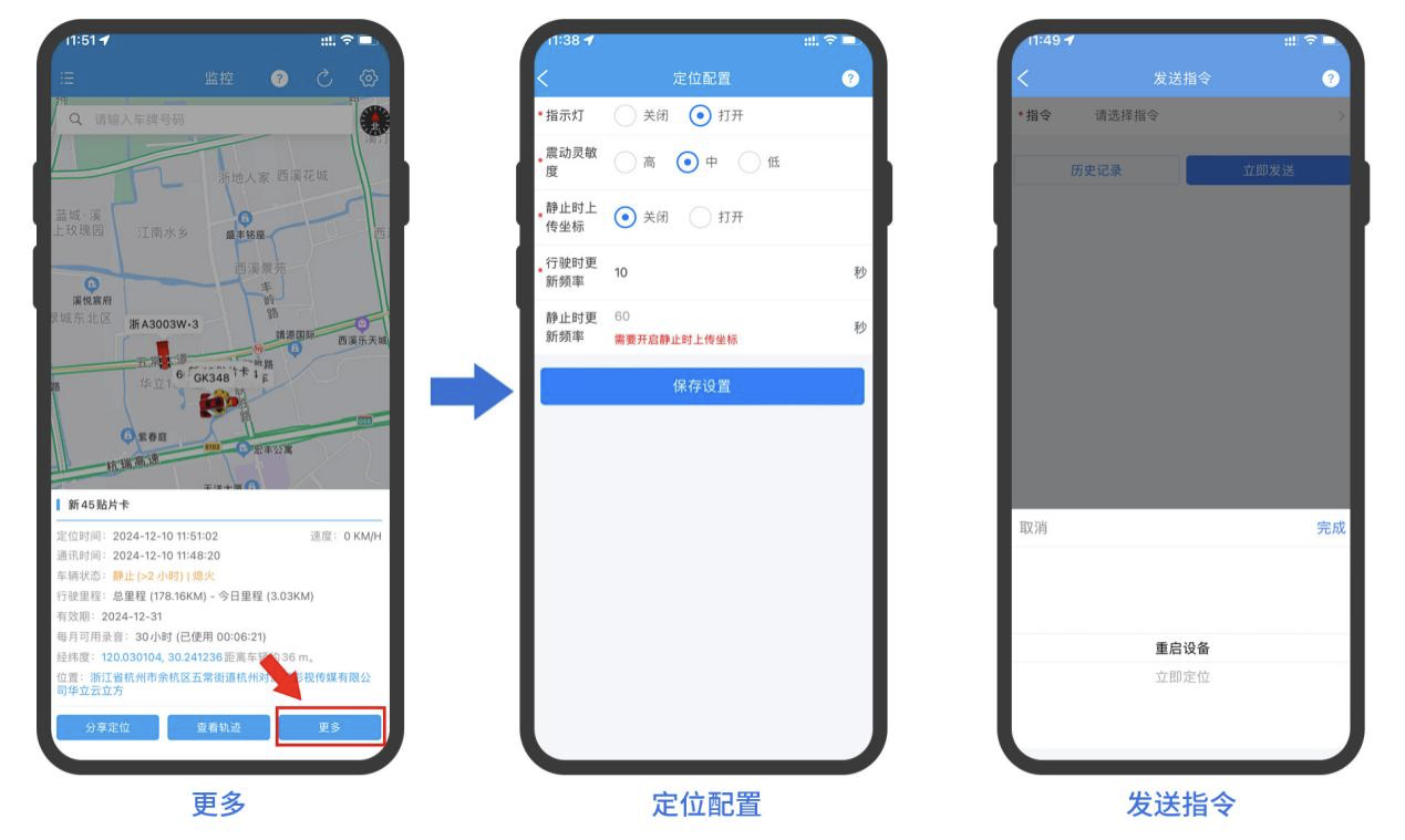 在监控页面的地图上找到并点击需要配置的车辆图标。接着,在弹出的下方定位详情中,点击右下角的更多/更多功能按钮,之后在弹出的菜单中选择定位配置或发送指令。